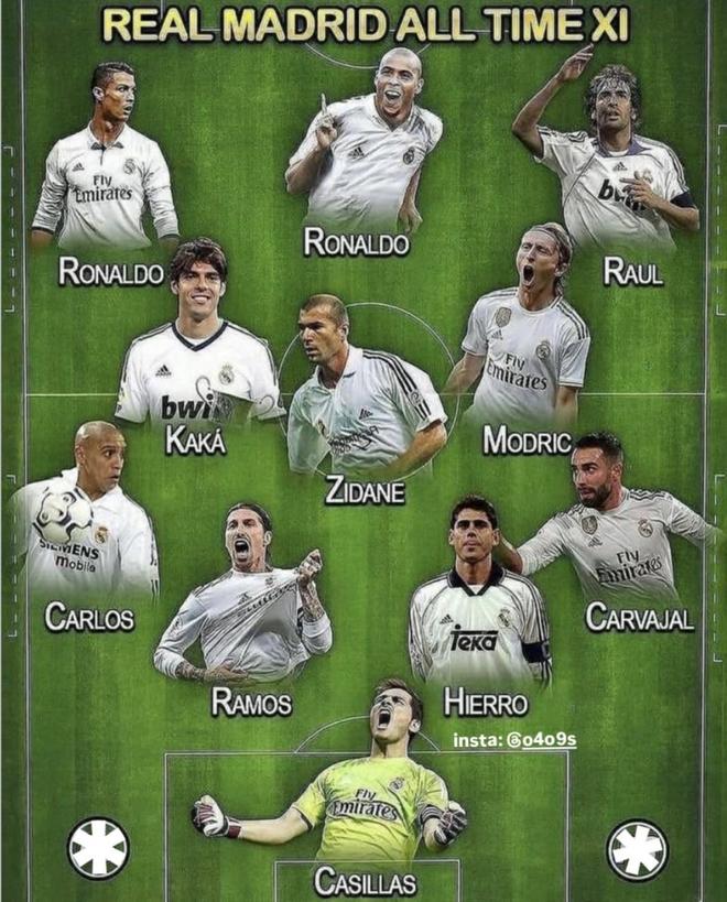 这套皇马全时XI极度进攻:C罗+大罗+劳尔三箭头,门前效率顶级;齐达内+莫德里奇+卡卡三名持球大师,组织与节奏上限极高;卡洛斯、卡瓦哈尔提供纵深与传中,拉莫斯+耶罗空中统治力强,卡西门线反应与关键球能力可靠。