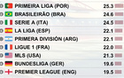 • 各联赛每90分钟犯规次数榜:葡超25.3次居首、意甲24.5次第三